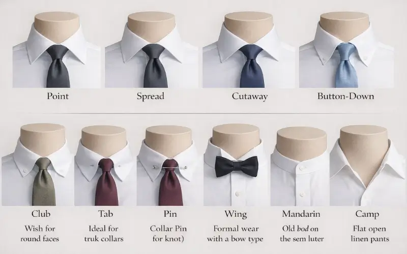 From classic options like the point and spread collar to modern choices like the mandarin or camp collar, each style brings its own level of formality and personality. Understanding how different collar shapes complement your face, suit your body proportions and match your outfit helps you dress with intention rather than guesswork.