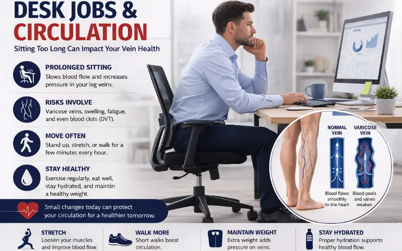 Desk jobs have become a normal part of life in this digital economy today. From Corporate offices to work from home millions of people are sitting glued in front of the screens for hours with very little movement throughout the day. Although such a shift is efficient and more convenient, it has brought a lot of health concerns that are not overtly visible. Of all potential circulatory system problems, prolonged sitting is the one that can do constant damage to our veins.