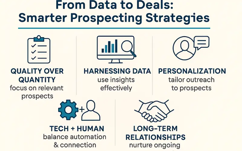Smart prospecting does not mean putting more names into a database or acting merely on technology. It is all about using the power of data and having empathetic interactions with humans. Data to deals: By prioritizing quality over quantity, using meaningful data to leverage it, personal communication, and balancing automation with genuine interaction, businesses can develop prospecting strategies that can really go the distance: data to deals.